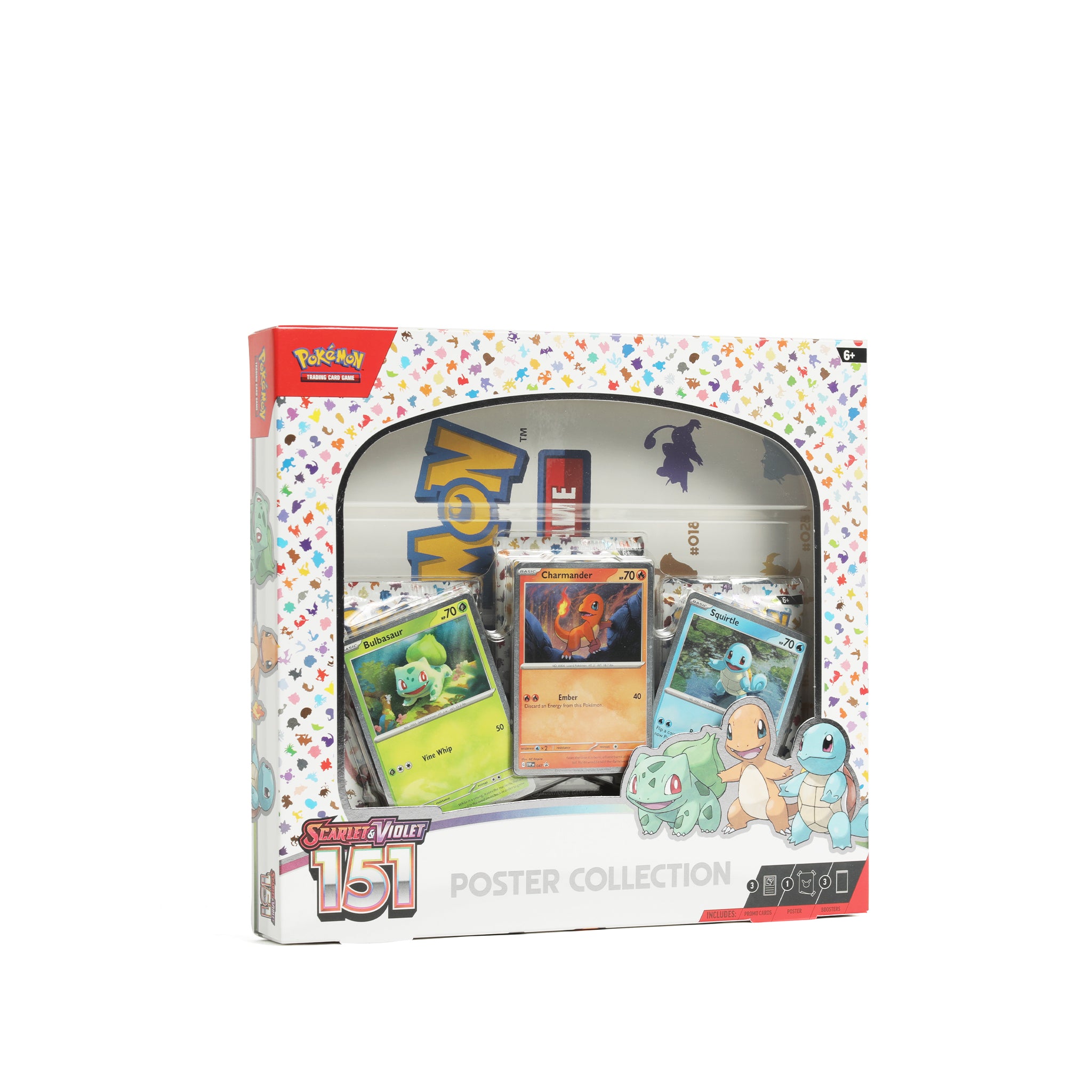 An epic journey through the Kanto region wouldn’t be complete without a first partner Pokémon! Add Bulbasaur, Charmander, and Squirtle to your team as playable foil promo cards, then work on completing your Kanto Pokédex by opening more booster packs from the special Scarlet & Violet—151 expansion. On top of it all, you’ll find a colorful poster that’s ready to hang wherever you like!